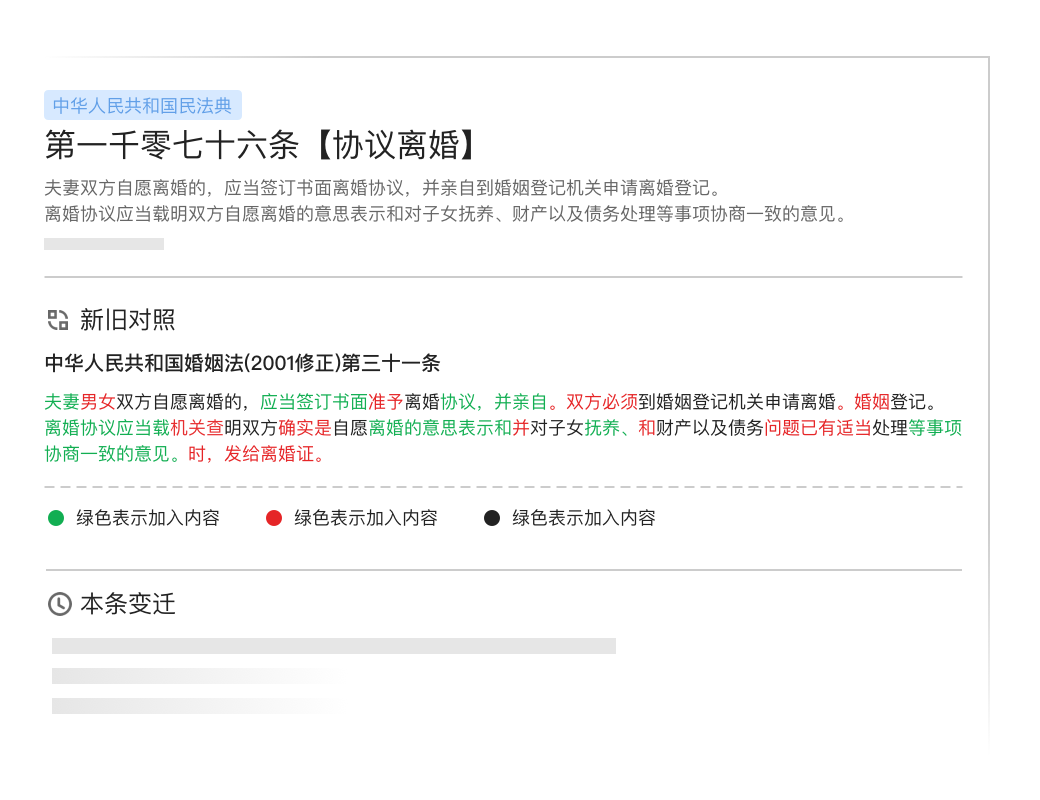 法律条文“本条变迁”“新旧对照”一目了然,便于用户进行新旧法条比对,通过旧条文理解新法条内容,避免知识理解的滞后,助力了解法条变迁背后的法理