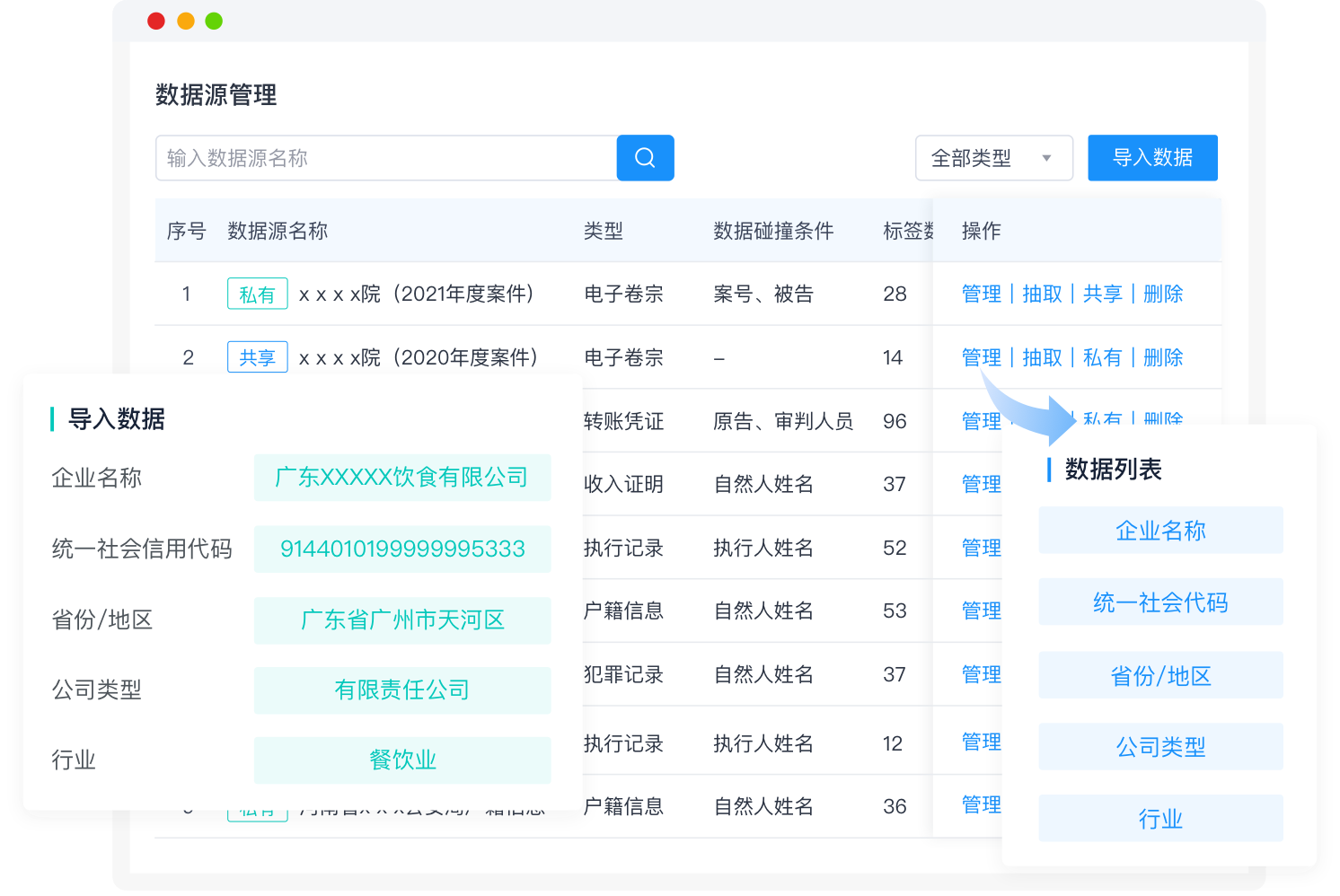 支持多种Excel表格数据导入,删除重复数据、格式化数据、对每列数据设置标签,便于要素抽取。